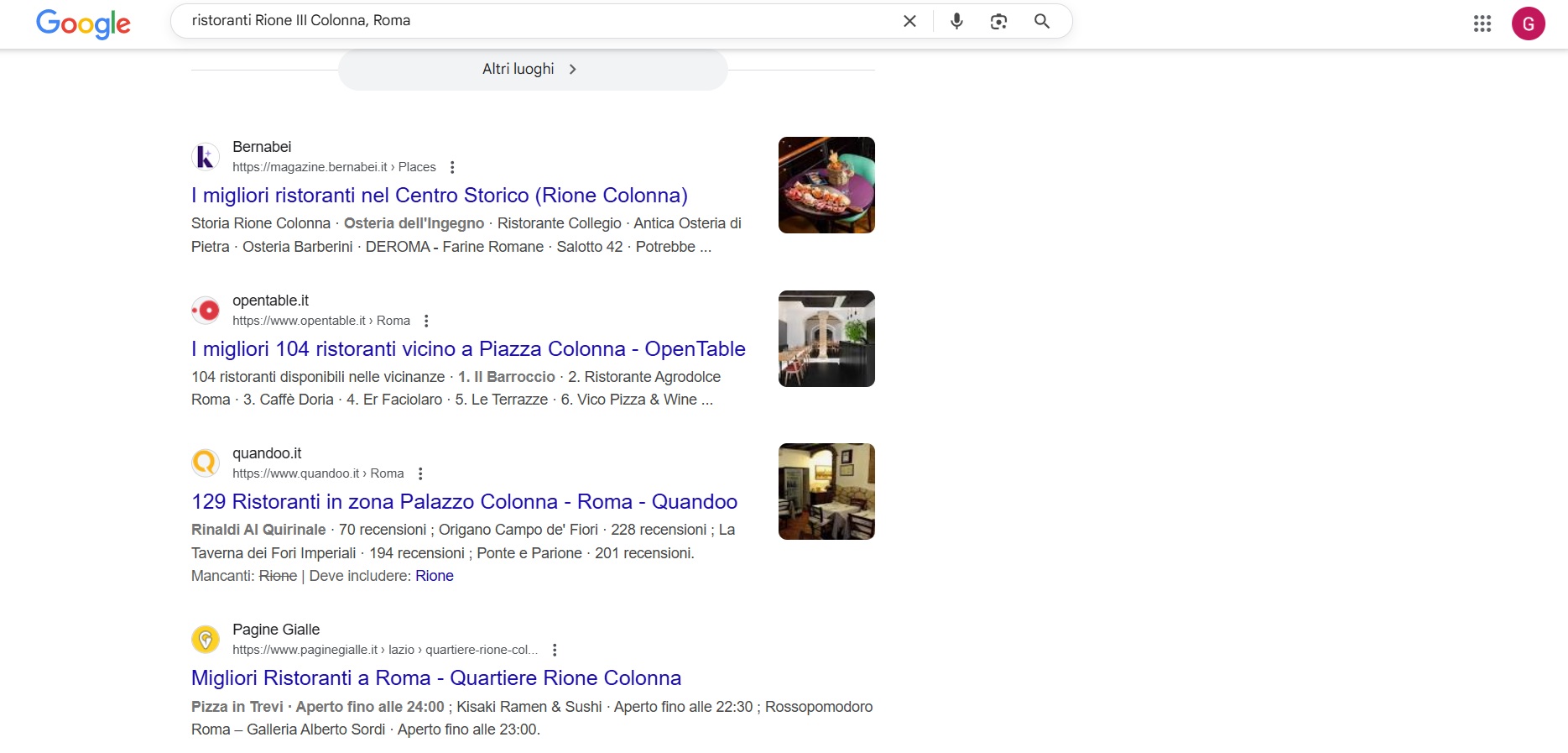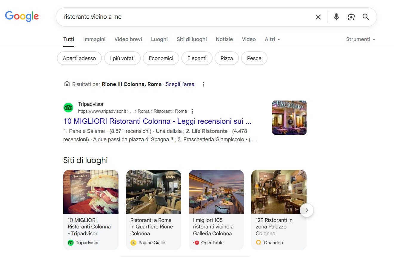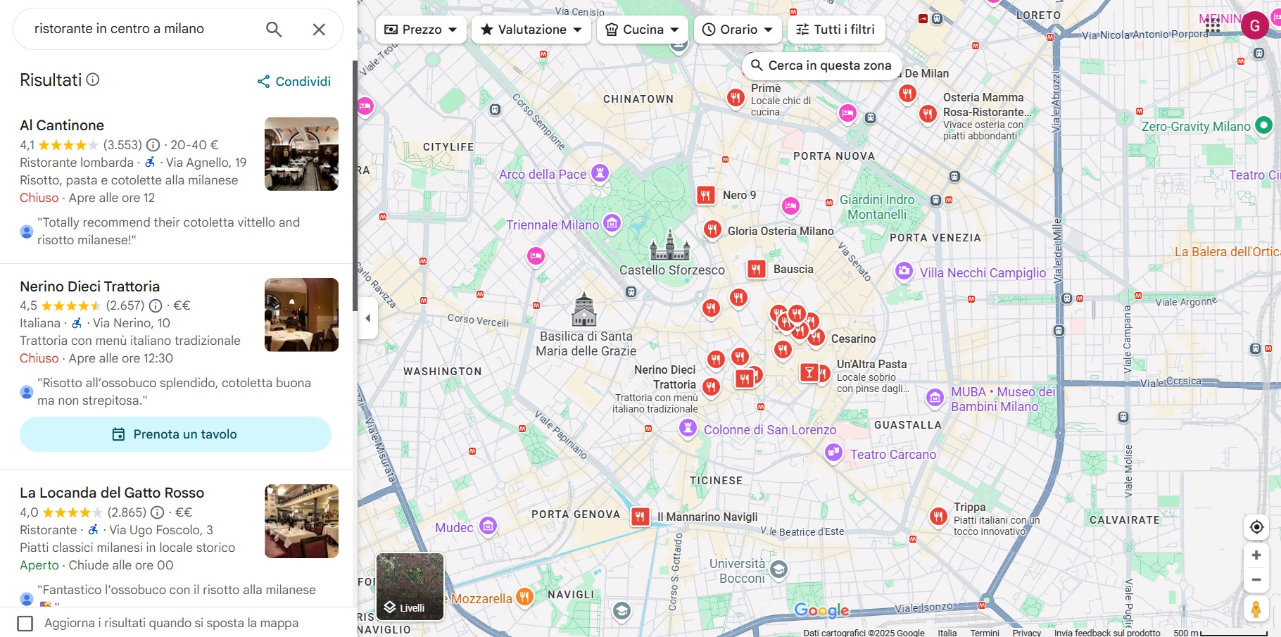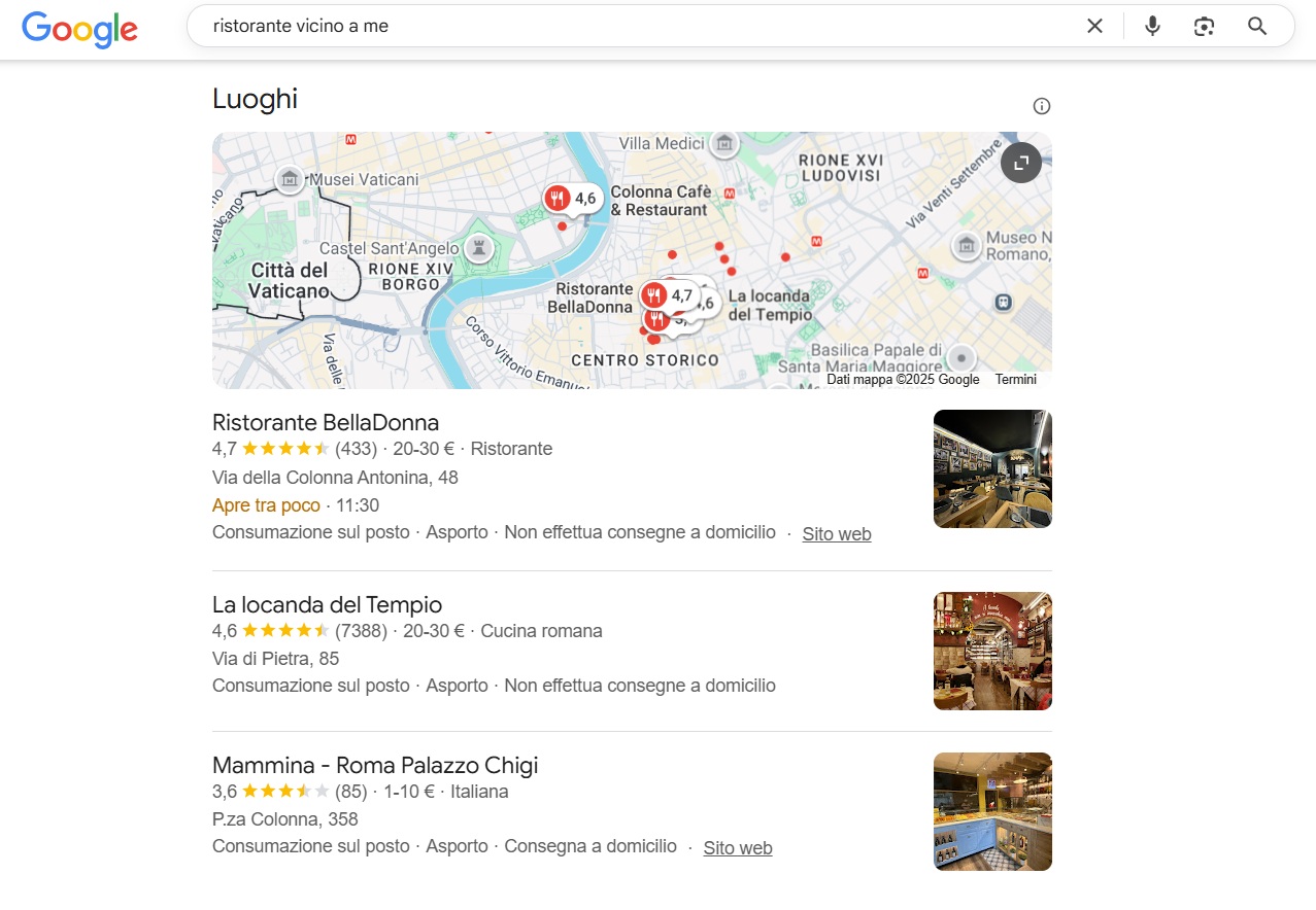 Esempio: se gestisci una pizzeria a Bologna, potresti comparire tra i primi risultati quando qualcuno cerca “pizzeria” o “pizza da asporto” in quella zona.