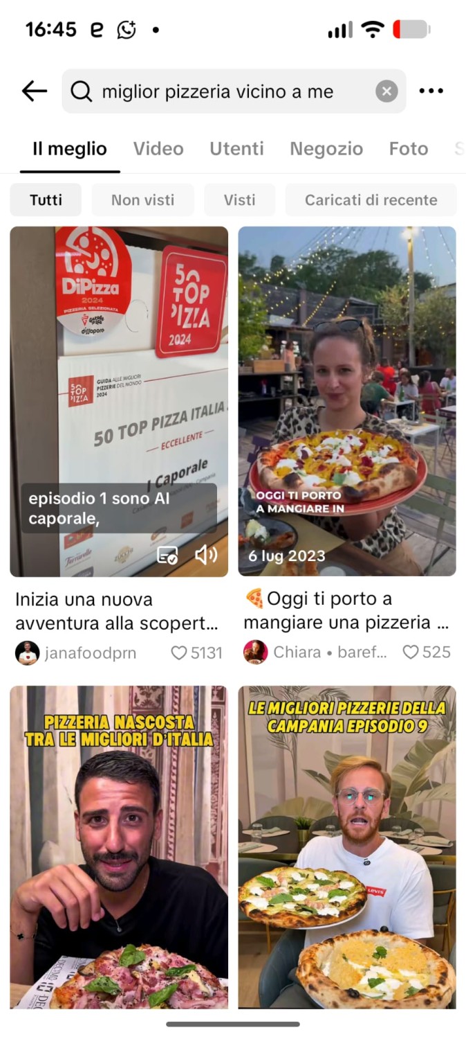 TikTok offre una ricerca visiva, emozionale e immersiva. Gli utenti digitano query come "miglior pizzeria vicino a me" e ottengono video brevi, personalizzati e geolocalizzati. Il contenuto creato da creator locali è percepito come più genuino e affidabile rispetto a recensioni testuali o pubblicità tradizionali.