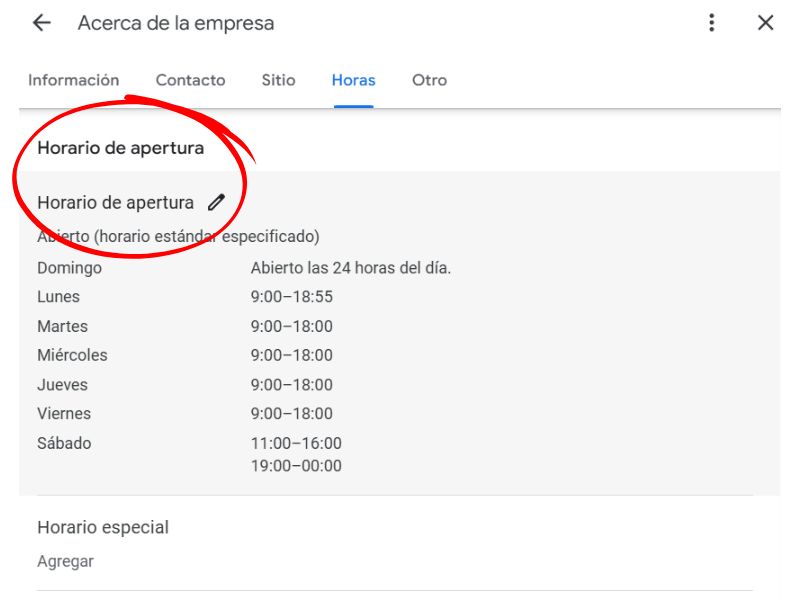 - En caso de horarios estacionales (por ejemplo, negocios turísticos), puedes configurar horarios distintos en “horarios especiales” según el periodo de apertura.